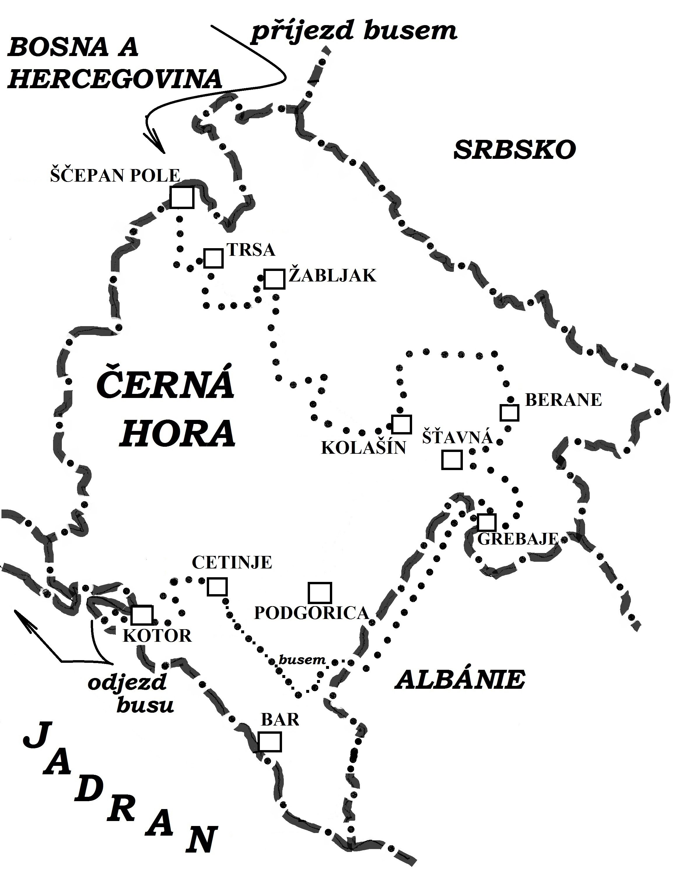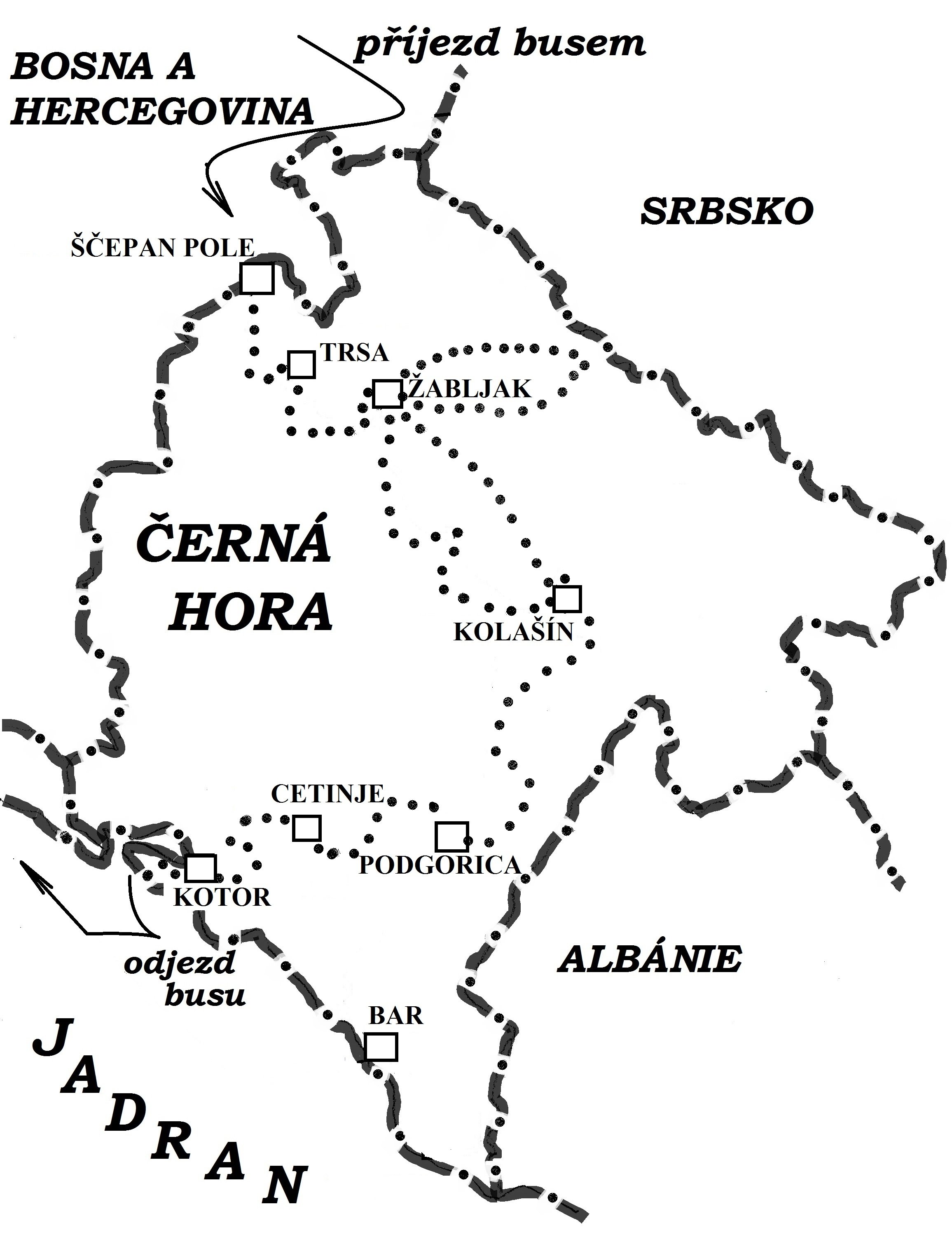 1.den: Odjezd z Prahy v 16,00 přes Brno, Slovensko, Maďarsko, Chorvatsko a Bosnu do Černé Hory.