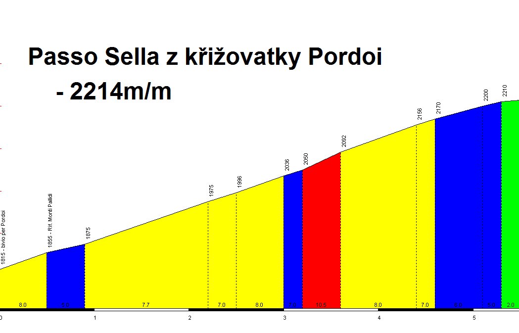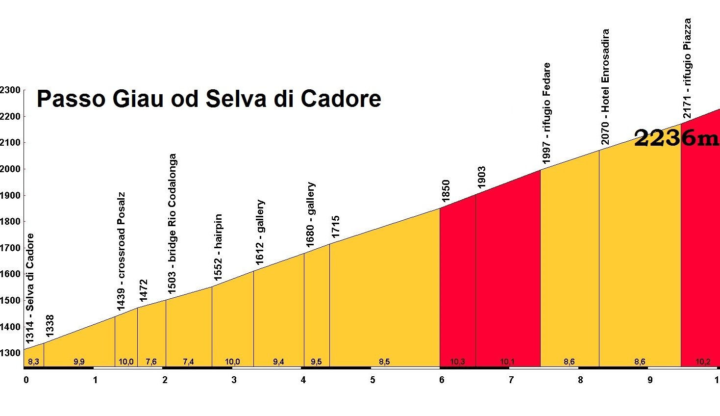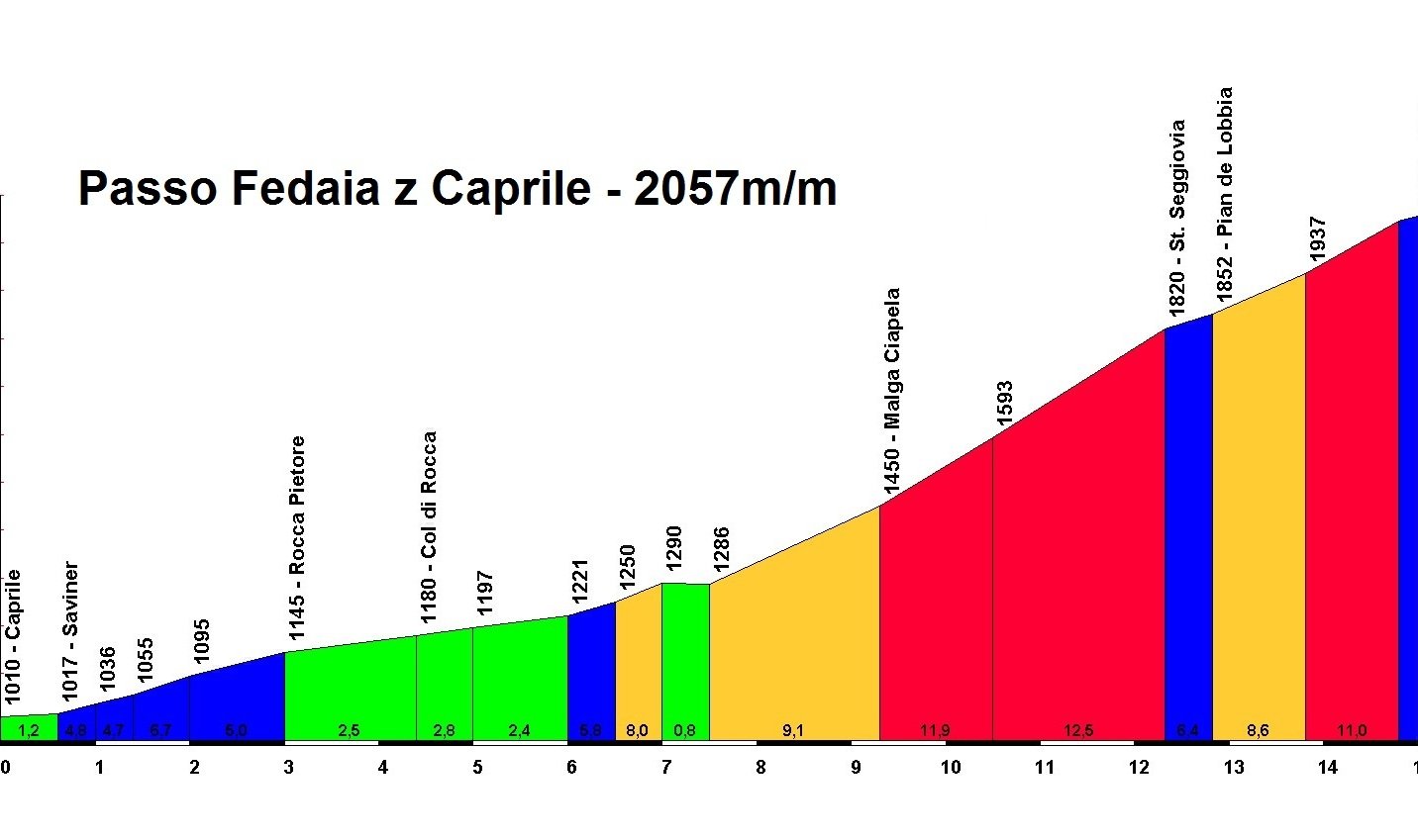 Trochu si hrábnout v nádherných horách, a to pod nejvyšší horou celých Dolomit - MARMOLÁDOU, připomenout si machrovinu účastníků slavné Giro a hlavně si užít komorní skupinku maximálně 16 lidí tohoto zájezdu, - to je to, oč tu běží. Koho ani tohle nepřesvědčilo, tak ho snad zlomí jména a výška nejkrásnějších a nejnáročnějších horských sedel italských Dolomit, kde se rádi vyfotíte u vrcholových cedulí se jmény jako Passo di FEDAIA-2057m, Passo SELLA-2240m, Passo GARDENA-2137m, Passo PORDOI-2242m, Passo VALPAROLA-2192m, Passo FALZAREGO-2105m, Passo GIAU-2236m či Rifugio AURONZO-2320m.