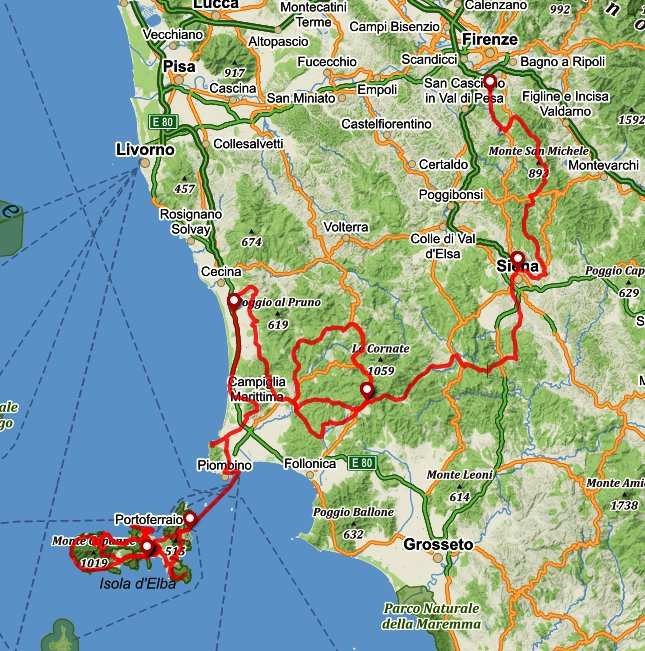 V porovnání třeba s Korsikou je Elba celkem maličká a proto využijeme bydlení na jednom místě a hvězdicovitých výletů do okolí. Celý týden by ale byl příliš dlouhý a proto strávíme ještě před přeplutím na Elbu čtyři krásné dny v Toskánsku a to přes vinařský kraj Chianti, Sienu a krásná městečka v oblasti Etruského pobřeží až do Piombina, odkud se přeplavíme na Elbu.