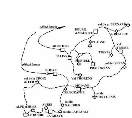 Tak se zase vracíme po Švýcarsku a Slovinku do „našich“ cyklistických francouzských velehor. A protože nám roky nikdo neubírá, bylo zapotřebí na vrcholech či sedlech připravit trochu komfortu. Ten nám zajistí světová snobská lyžařská střediska. Netěšte se, nebudeme tam bydlet, dáme tam jen pivko a pojedeme zase dolů – no prostě naše klasika. Historičtí účastníci extremtouráckých EUROSEDEL si budou moci zavzpomínat na sněhovou vichřici na Galibier (letos ho ale pojedeme obráceně) nebo na crossové bloudění kolem Col de la Croix de Fer. Také opětovný výjezd do Alpe-d´Huez určitě rozproudí naše vzpomínky. Dost netradiční ale budou výjezdy do středisek ve slavném lyžařském ráji Les 3 Vallées. Pro nadržené vlčáky bude dostatek možností si odskočit i do vedlejších údolí a sedel, která sice nemáme v programu, ale jsou tak lákavě nablízku. No prostě si na našem skoronovém zájezdu dosyta užijete nádherných údolí, horských sedel a alpských silniček v centru Savojských Alp. Cyklistické etapy měří od 70 do 110 km. Jezdíme ve skupinkách dle vlastního výběru nebo i samostatně. Jezdí se nalehko - a v poledne je „někdy“ umožněn nepovinný sraz s autobusem, kde si můžete uvařit a případně i nasednout do busu a zbytek etapy dojet s ním. Vedoucí zájezdu si vyhrazuje právo změny programu dle počasí.