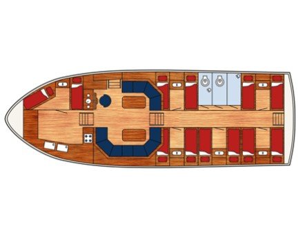 VYBAVENÍ LODI: 5x dvoulůžková kajuta bez paland, 2x sprcha, 2x WC. Další soc. zařízení je často k dispozici v přístavu. V každé kajutě je umyvadlo a el. zásuvka.