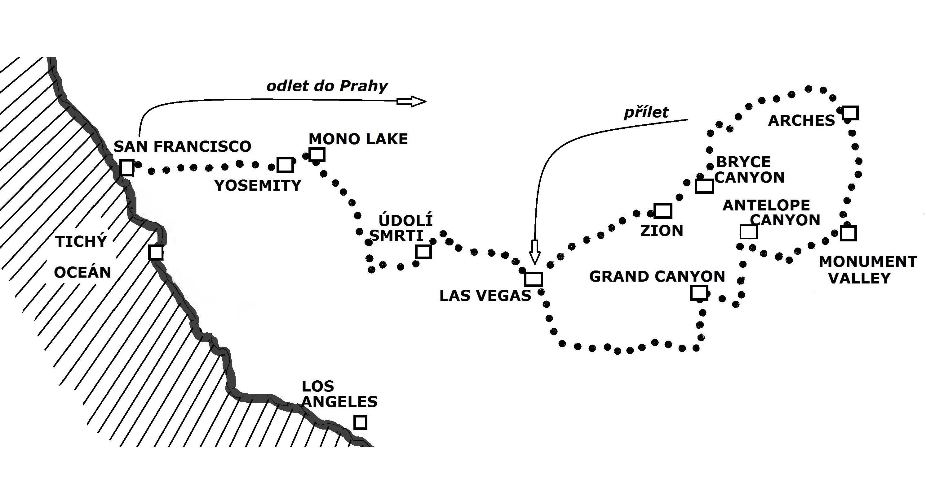 Náš výlet začíná v nejbláznivějším městě Spojených států – Las Vegas, odkud vyrazíme na východ za krásami americké přírody. První perlou na cestě bude světový přírodní zázrak č. 1 – Grand Canyon, kde bude dostatek času na tůru třeba až na dno kaňonu. Krátce na to navštívíme skutečně monumentální Monument Valley. Poté nemůžeme minout úžasně fotogenické NP Arches s velkolepými skalními oblouky. Následující Bryce Canyon s růžovými pískovcovými věžičkami určitě uspokojí všechny fotografy. Odtud se přemístíme kousek do slavného lezeckého Zionu. Ještě jednou projedeme Las Vegas a už na nás bude čekat slavné Údolí Smrti. Od romantického Mono Lake přes Tiogu Pass vjedeme do nevěřitelných a úžasně rozmanitých Yosemit. Dva dny budete obdivovat tento NP s největší monolitní stěnou světa El Capitan a gigantickými sequoiemi. O slavných vodopádech ani nemluvě. Pak už na nás čekají 2 celé dny v nejkrásnějším americkém městě – San Francisco. Vedoucí zájezdu si vyhrazuje právo změny programu dle počasí.