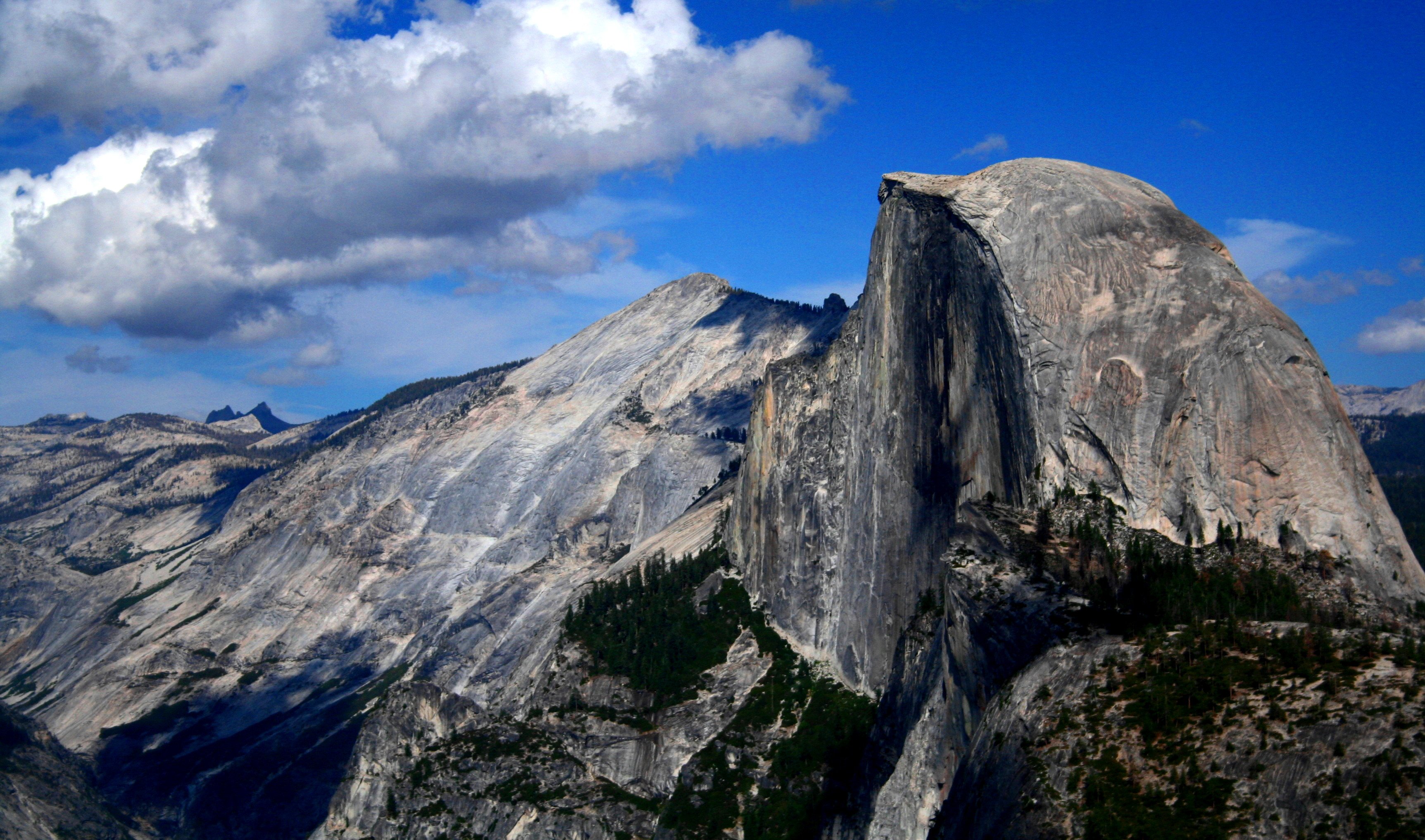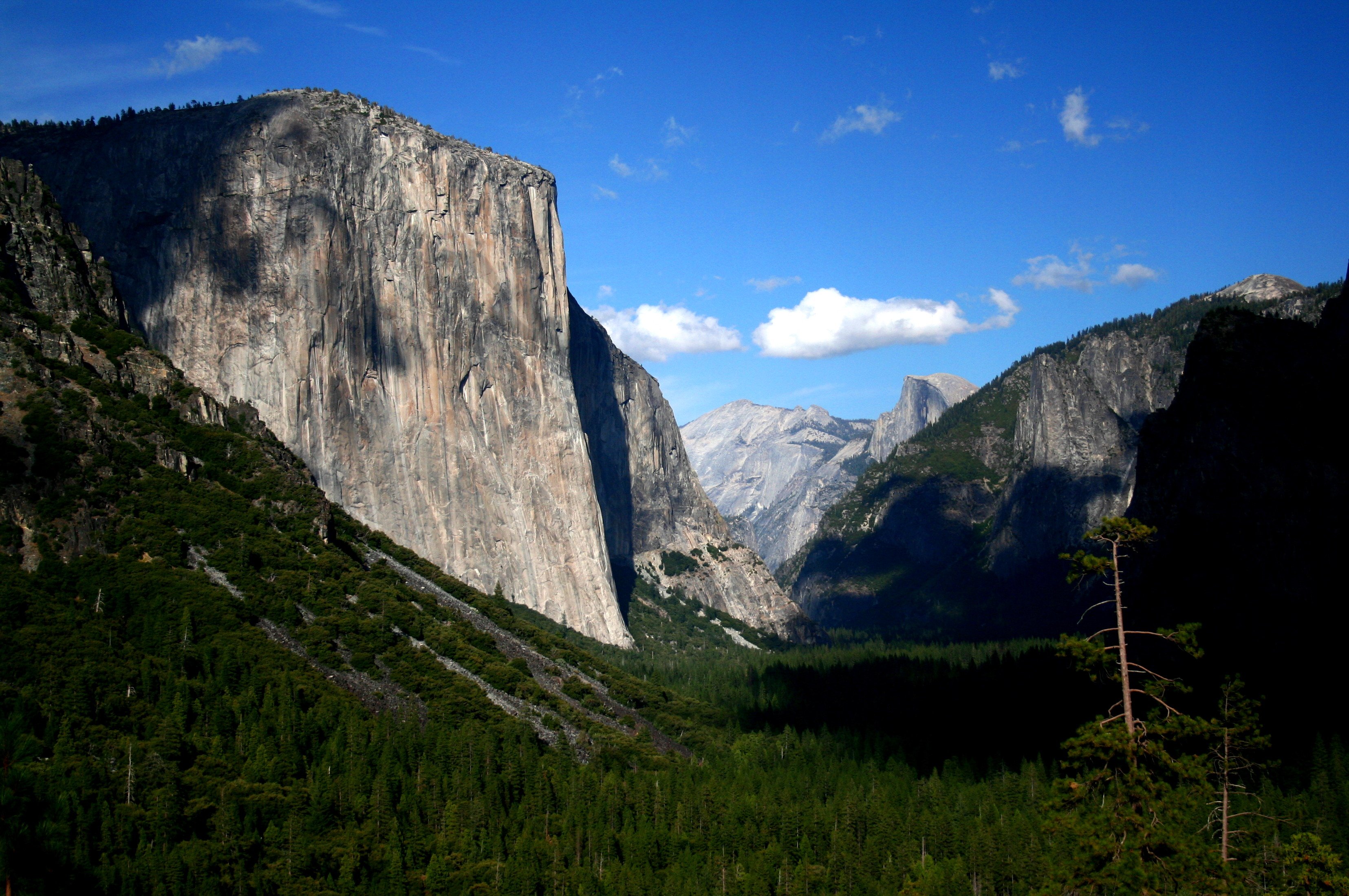 YOSEMITE NP Yosemitský národní park leží na západním úbočí pohoří Sierra Nevada a proslavil se mohutnými žulovými masívy, vysokými vodopády a bohatou přírodou. EL CAPITAN (2307m) je nejvyšší odkrytý žulový monolit na světě. Kolmá, místy lehce převislá stěna vysoká 1100m je metou všech špičkových horolezců. HALF DOME (2695m) je nejvyšší hora v údolí. Polovinu (half) jejího oblého tvaru na straně do údolí obrousil mohutný ledovec do kolmé stěny.